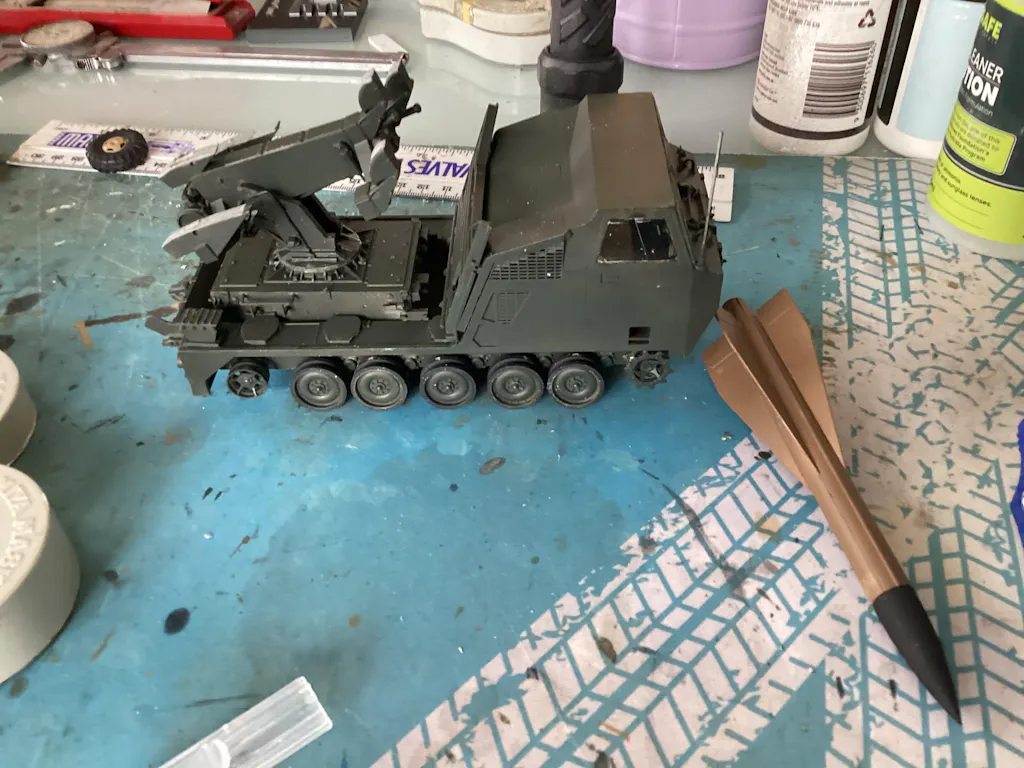 M727 Carrier: Accurately reproduces the M548-based tracked chassis, featuring the specific driver's cab, blast deflectors, and rear-mounted missile system used by the US Army.