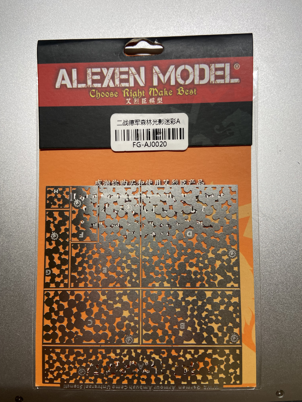 FactsBrand:Alexen ModelTitle:WWII German Ambush Camouflage Stencil Type ANumber:FG-AJ0020Scale:1:35Type:Masking setReleased:2020 New toolPackaging:BaggedTopic:Camouflage patterns » Bits & pieces (Accessories)